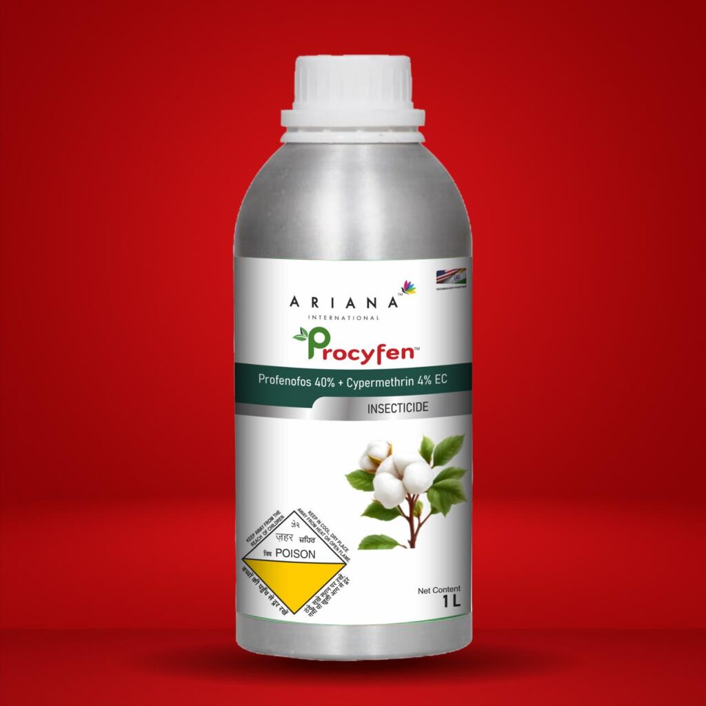 Procyfen™ एक शक्तिशाली व्यापक स्पेक्ट्रम कीटनाशी है जिसमें दो सक्रिय घटक होते हैं: प्रोफेनोफॉस (ऑर्गेनोफॉस्फेट) और साइपरमेथ्रिन (पायरेथ्रॉयड)। यह संयोजन चूसक कीटों और बॉलवर्म्स पर उत्कृष्ट नियंत्रण प्रदान करता है, विशेष रूप से कपास और सब्ज़ियों में।